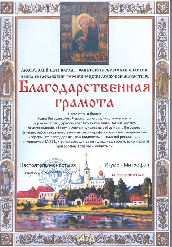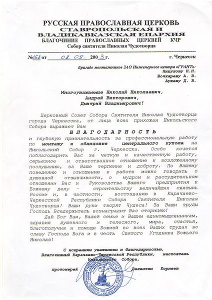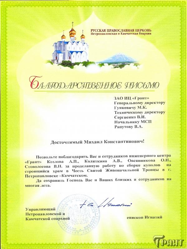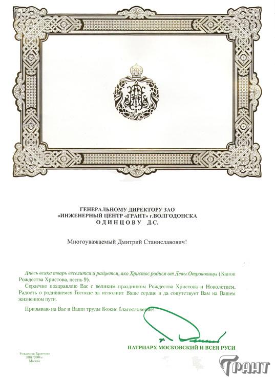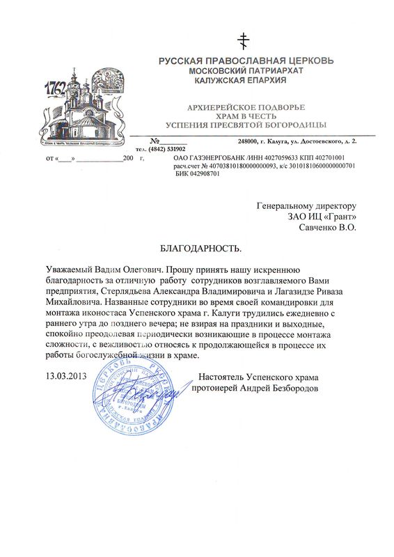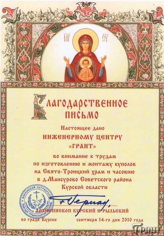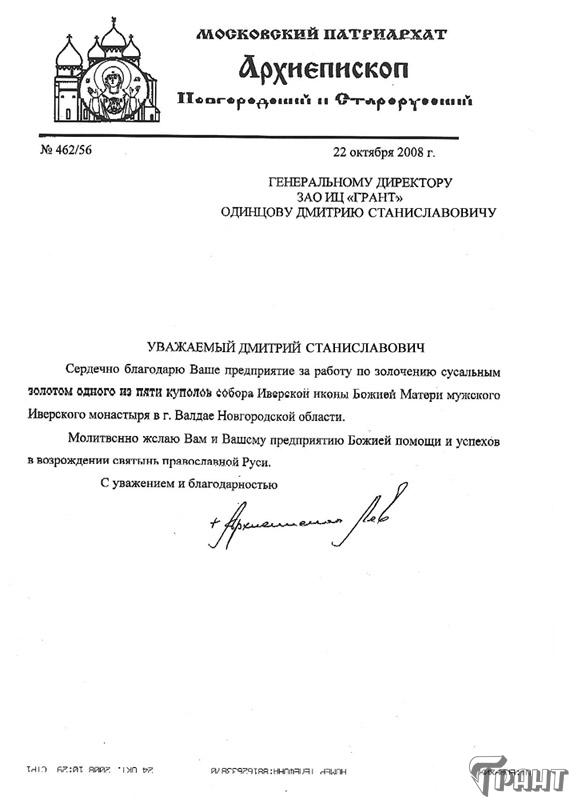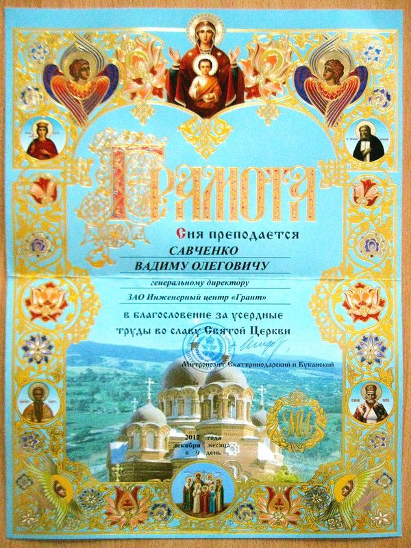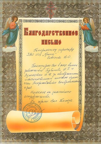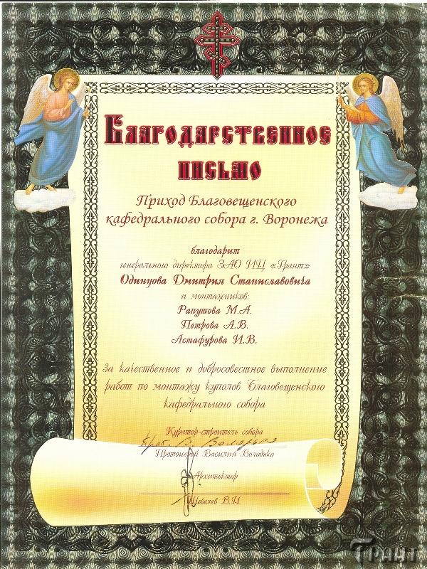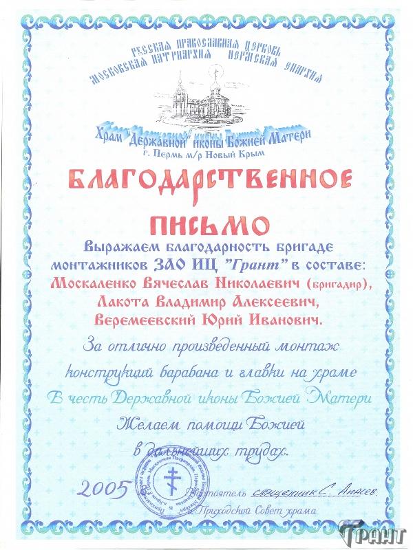 Помимо благодарственных писем, предприятие "Грант" имеет благословения на осуществление деятельности в области церковного строительства от высших чинов и организаций РПЦ: