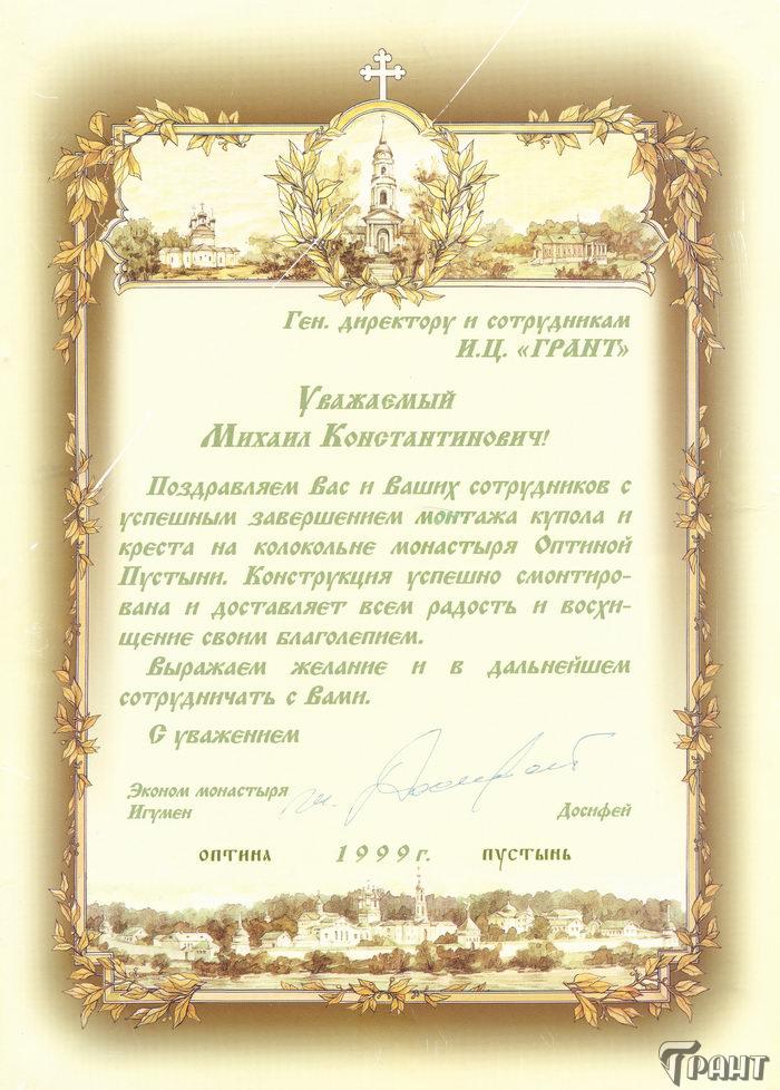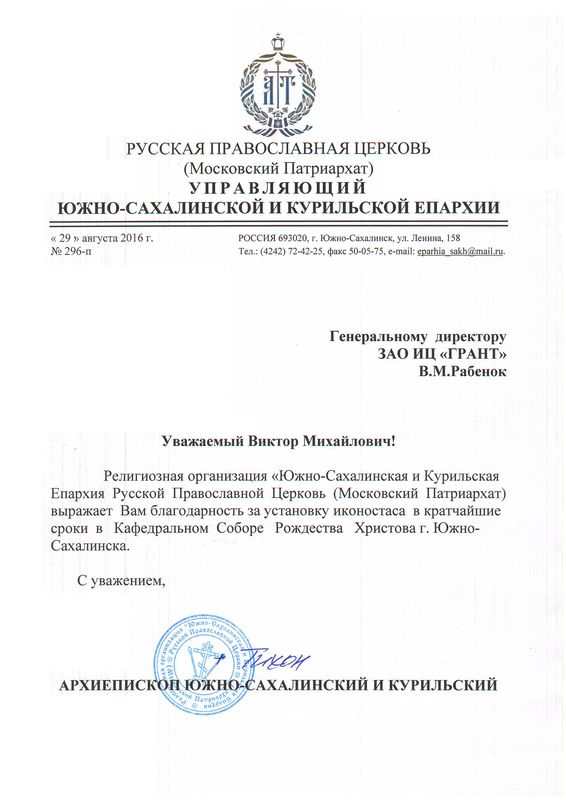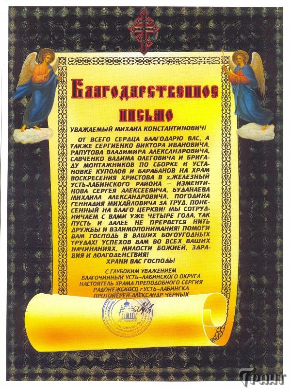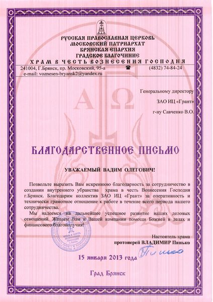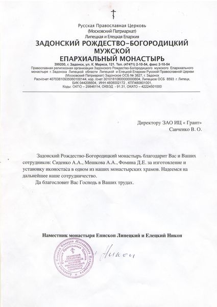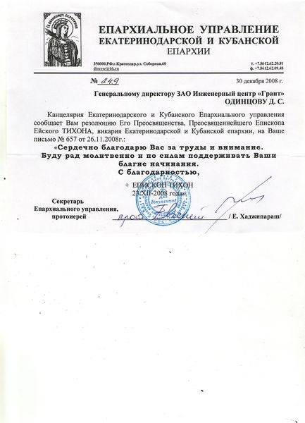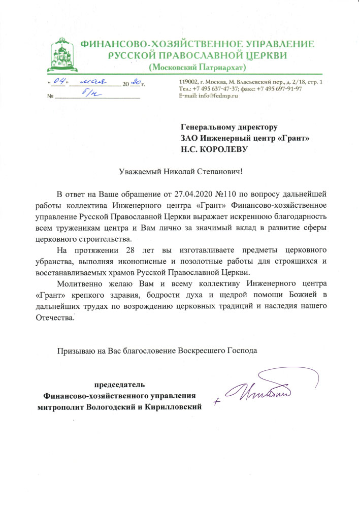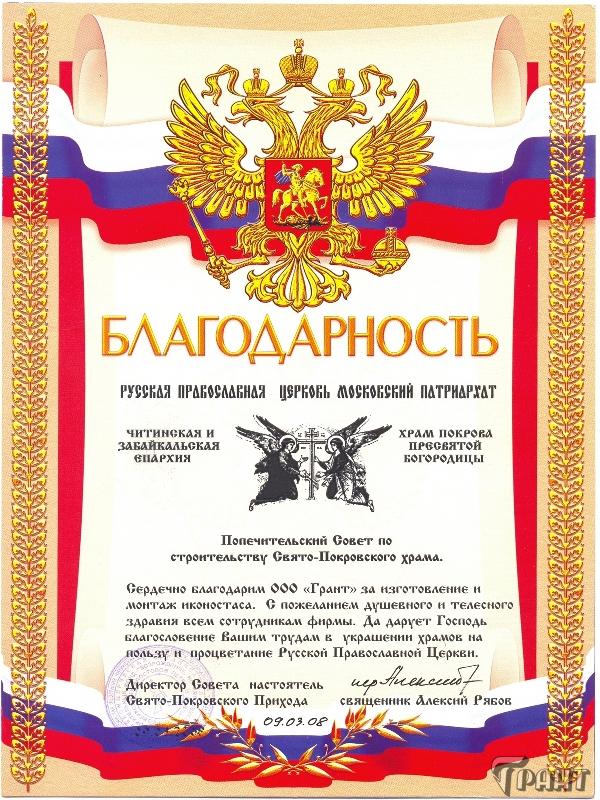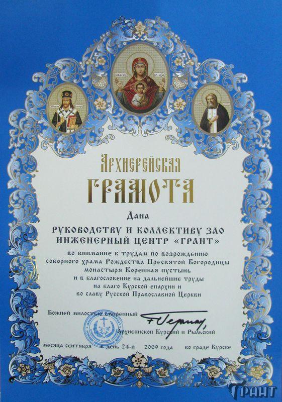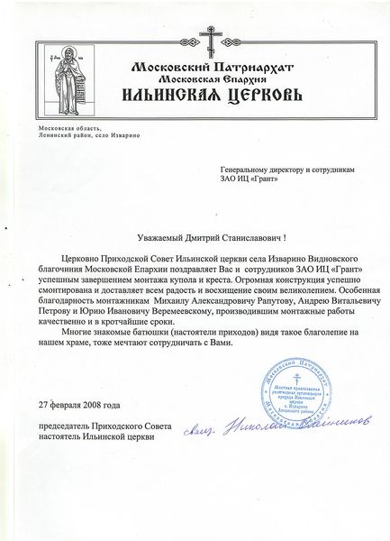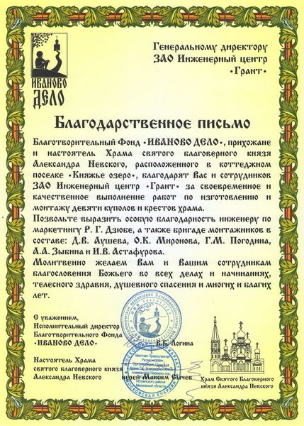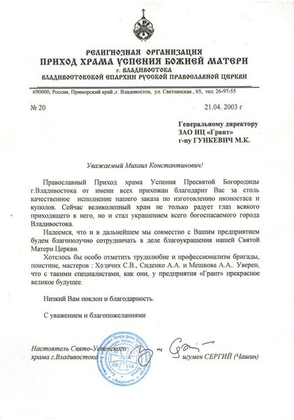 Помимо благодарственных писем, предприятие "Грант" имеет благословения на осуществление деятельности в области церковного строительства от высших чинов и организаций РПЦ: