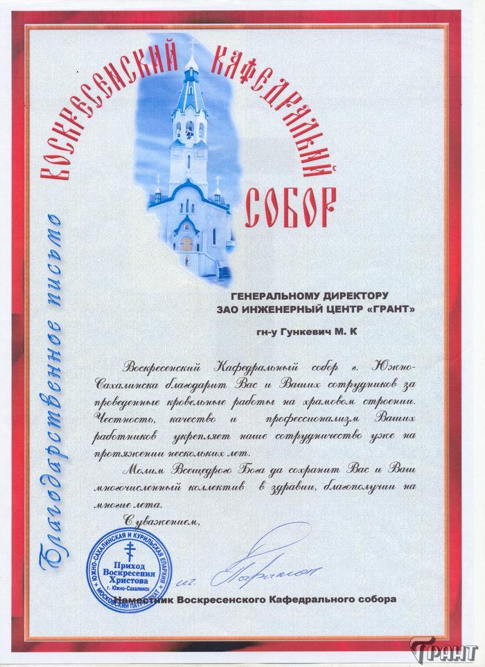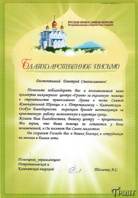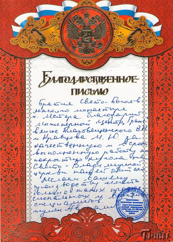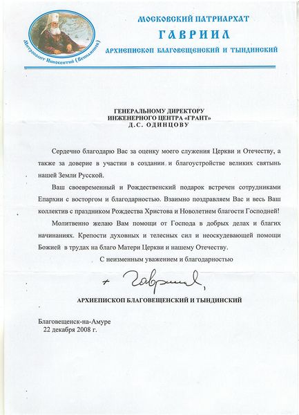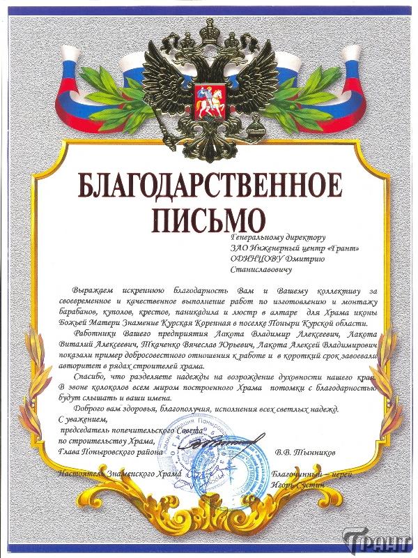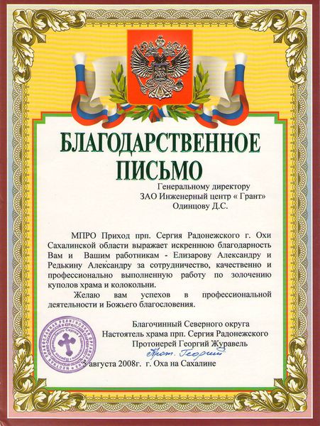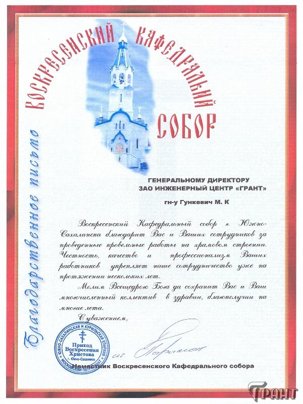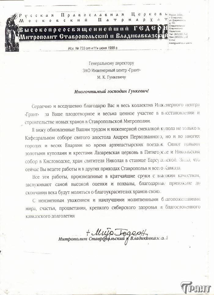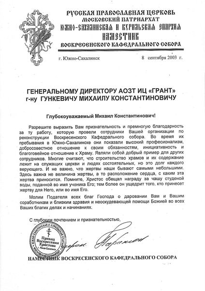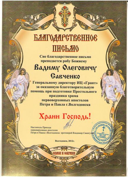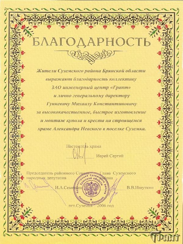 Помимо благодарственных писем, предприятие "Грант" имеет благословения на осуществление деятельности в области церковного строительства от высших чинов и организаций РПЦ:
