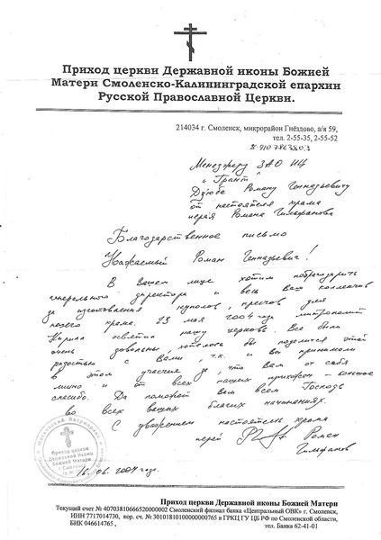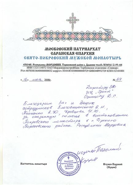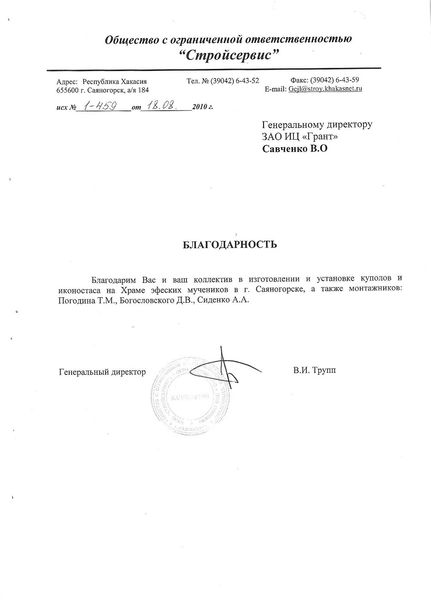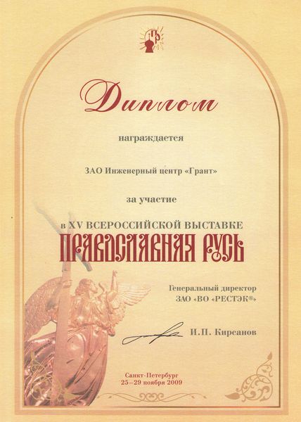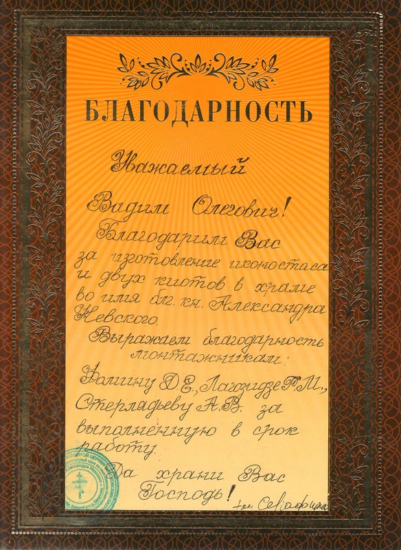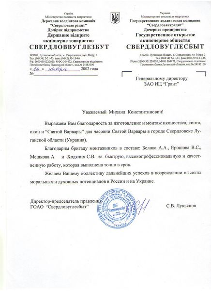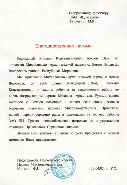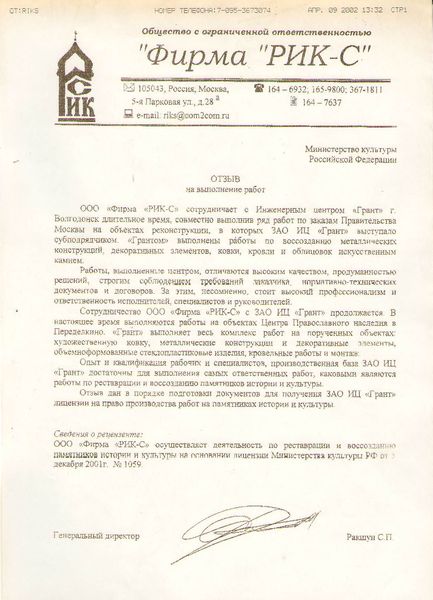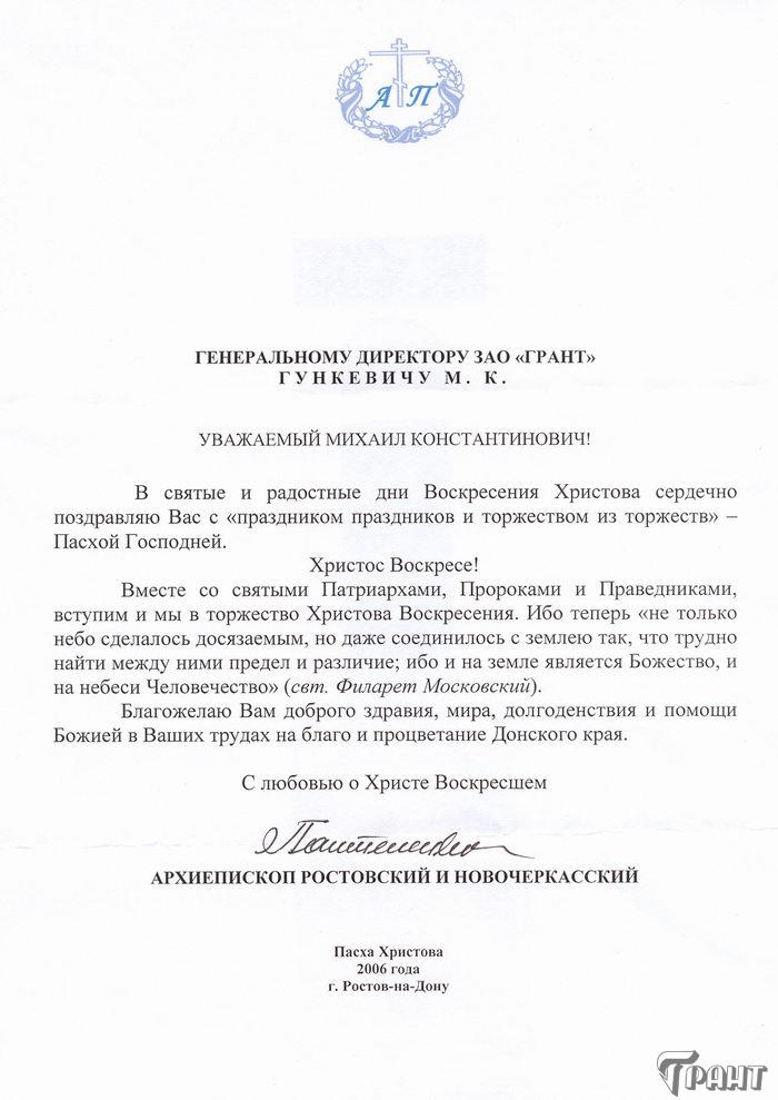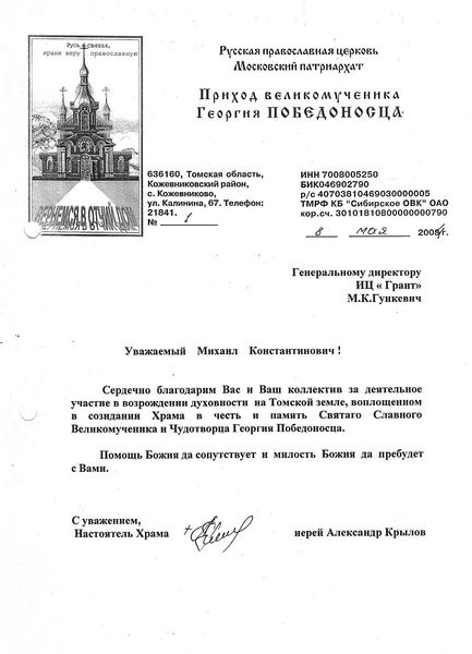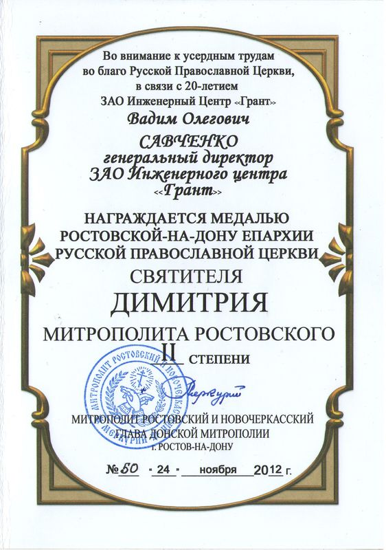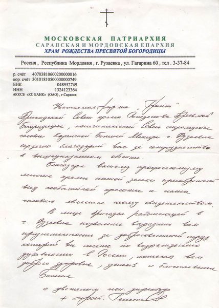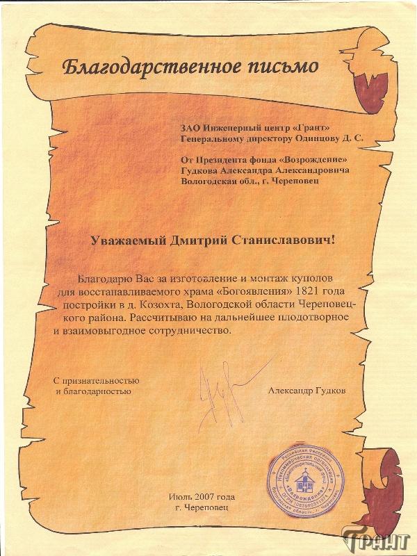 Помимо благодарственных писем, предприятие "Грант" имеет благословения на осуществление деятельности в области церковного строительства от высших чинов и организаций РПЦ:
