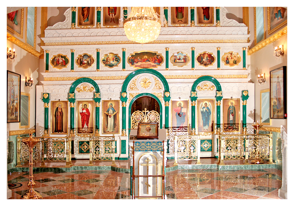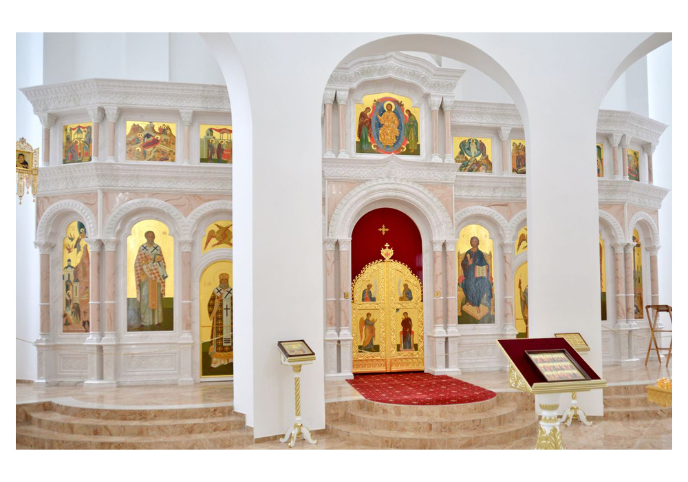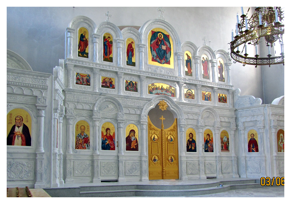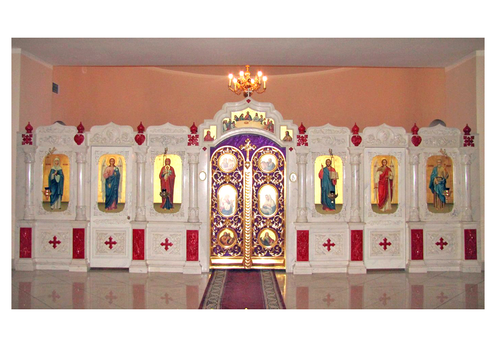 - Иконостасы из литьевого камня с имитацией природных камней: мрамора, малахита, оникса, гранита, песчаника и др.;