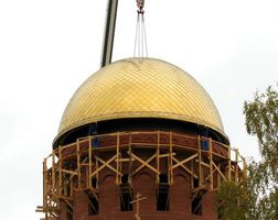 В производстве куполов, крестов, кровельных и облицовочных работах Инженерный центр «Грант» применяет нержавеющую сталь с нитридом-титановым напылением «под золото». Это современный технологичный материал, обладающий высокой антикоррозионной способностью.